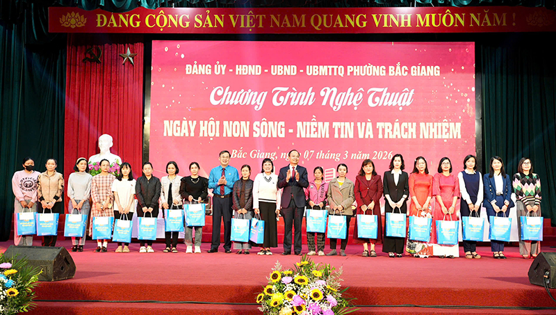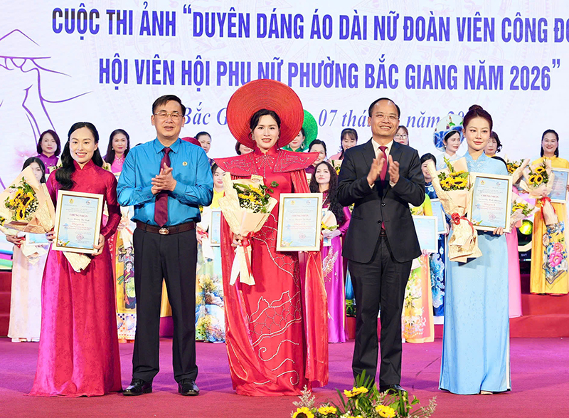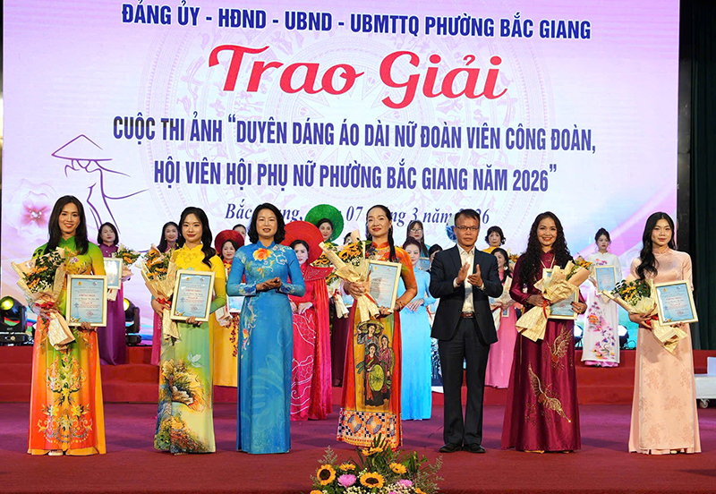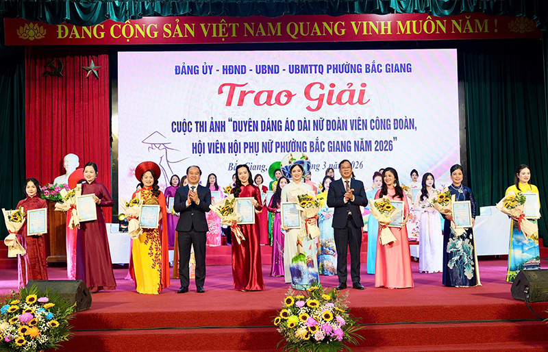 Cũng trong chương trình, nhân dịp kỷ niệm Ngày Quốc tế Phụ nữ 8/3, để trân trọng, khẳng định vai trò, vị trí, những đóng góp quan trọng và tôn vinh nét đẹp duyên dáng của phụ nữ nói chung và của nữ cán bộ, đoàn viên, hội viên phụ nữ phường Bắc Giang, Ban Tổ chức tặng quà cho 100 nữ đoàn viên công đoàn vượt khó vươn lên. Mỗi suất quà trị giá 1 triệu đồng. Đồng thời, BTC trao giải Cuộc thi ảnh “Duyên dáng áo dài nữ đoàn viên công đoàn, hội viên phụ nữ phường Bắc Giang năm 2026 cho 30 tác phẩm xuất sắc trong tổng số 156 tác phẩm tiêu biểu. Trong đó, có 3 giải A, 5 giải B, 10 giải C và 12 giải Khuyến khích. Các chị: Chu Minh Phương đến từ Công đoàn Bệnh viện Đa khoa Bắc Ninh số 1; Nguyễn Thị Oanh, Công đoàn Công ty TNHH Pearl Global Việt Nam; Hoàng Thị Bình, chi hội phụ nữ Vĩnh Ninh 3 xuất sắc giành giải A của cuộc thi ảnh./.