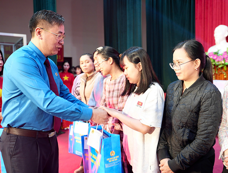 Đồng chí Thạch Văn Chung, UV BCH Tổng LĐLĐ Việt Nam, Tỉnh ủy viên, Phó Chủ tịch UBMTTQ, Chủ tịch LĐLĐ tỉnh Bắc Ninh tặng quà nữ đoàn viên công đoàn vượt khó vươn lên.