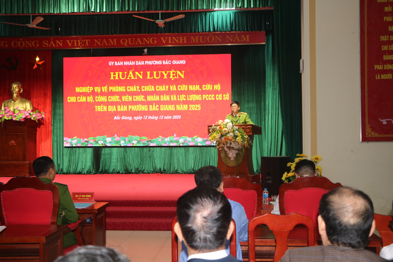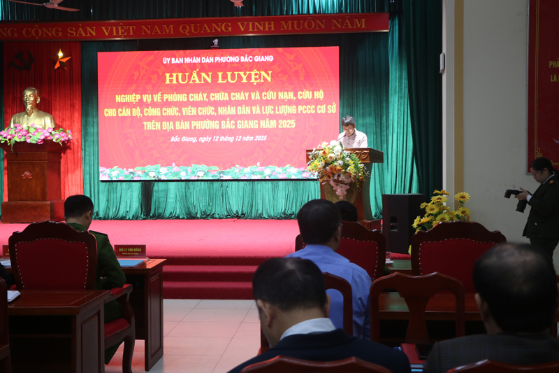 Ngày 12 -12, UBND phường Bắc Giang tổ chức hội nghị huấn luyện nghiệp vụ phòng cháy chữa cháy và cứu nạn cứu hộ (PCCC-CNCH) cho cán bộ, công chức, viên chức, nhân dân và lực lượng PCCC cơ sở trên địa bàn phường Bắc Giang năm 2025. Tham dự có các đồng chí: lãnh đạo Phòng nghiệp vụ công an tỉnh Bắc Ninh; đồng chí Vi Văn Toàn, Phó Bí thư Thường trực Đảng ủy phường Bắc Giang; Nguyễn Duy Hùng, Phó Chủ tịch UBND phường Bắc Giang; Thượng tá Lý Văn Đồng, Trưởng Công an phường Bắc Giang; các đồng chí bí thư các chi bộ, tổ trưởng các tổ dân phố và lực lượng PCCC tại cơ sở.