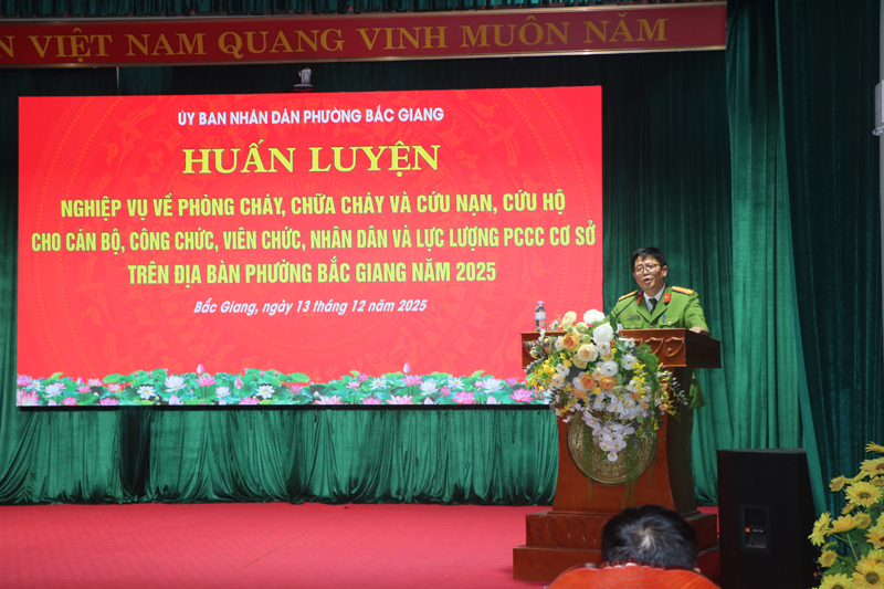 Ngày 13 -12, UBND phường Bắc Giang tổ chức hội nghị huấn luyện nghiệp vụ phòng cháy chữa cháy và cứu nạn cứu hộ (PCCC-CNCH) cho cán bộ, công chức, viên chức phường Bắc Giang năm 2025. Dự và chỉ đạo có đồng chí: Trần Văn Thanh, Chủ tịch UBND phường Bắc Giang; Thượng tá Lý Văn Đồng, Trưởng Công an phường Bắc Giang; cùng toàn thể cán bộ, chiến sỹ công an và cán bộ, công chức, viên chức phường Bắc Giang.