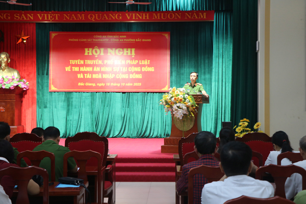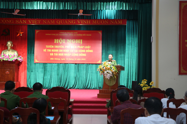 Chiều ngày 16-10, Công an tỉnh Bắc Ninh phối hợp cùng Công an phường Bắc Giang tổ chức hội nghị tuyên truyền, phổ biến pháp luật về thi hành án hình sự (THAHS) tại cộng đồng và tái hòa nhập cộng đồng. Tham dự có các đồng chí: Thượng tá Nguyễn Văn Hòa- Phó trưởng phòng PC10 công an tỉnh Bắc Ninh; Trần Văn Thanh- Chủ tịch UBND phường Bắc Giang; lãnh đạo Ngân hàng chính sách xã hội tỉnh Bắc Ninh; lãnh đạo, cán bộ, chiến sỹ Công an phường Bắc Giang; bí thư các chi bộ, tổ trưởng các tổ dân phố,...